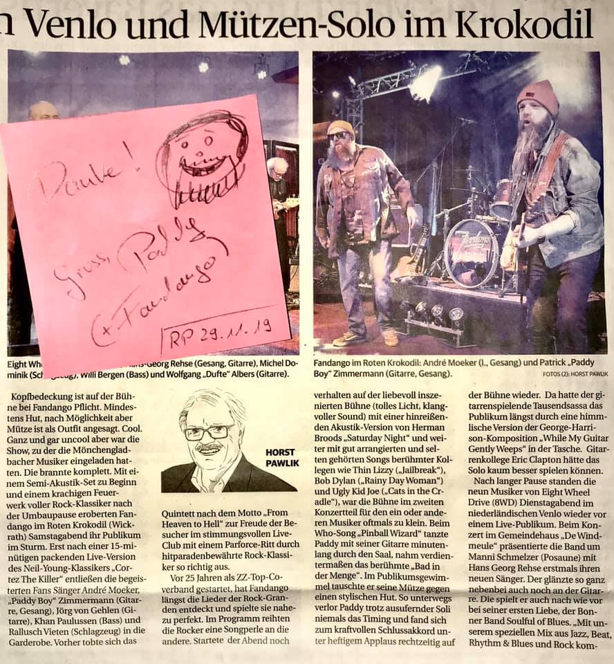 Im November spiele ich wieder mit Fandango im Roten Krokodil in Mönchengladbach – Wickrath. Es gibt ein neues Programm. Diesmal keine Revue mit Moderation um uns nicht zu schnell zu wiederholen, sondern Fandango im Doppelpack. Lasst euch überraschen! Die Tickets gibt es unter Anderem ab dem 28.10. (nach den Ferien) in meiner Gitarrenschule.
