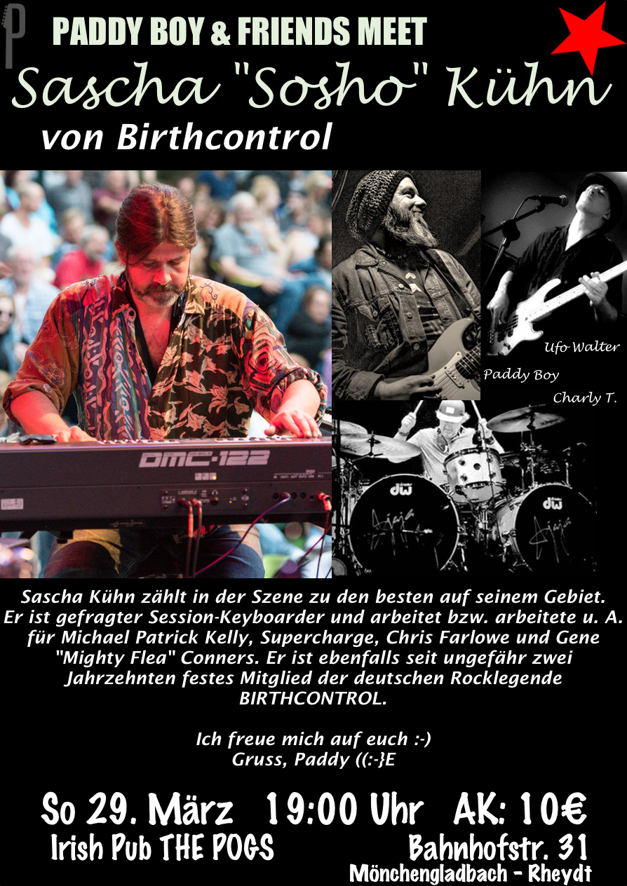 Es ist wieder soweit. Es steht ein neues „Paddy Boy & Friends meet“ Konzert an. Ab sofort finden diese Konzerte immer Sonntags statt und beginnen bereits um 19:00 Uhr. Ich spiele, wie immer, zusammen mit Charly T. (Westernhagen) an den Drums und Ufo Walter (Randy Hansen Band) am Bass im Trio und habe euch natürlich wieder einen ganz tollen Gast mitgebracht.
