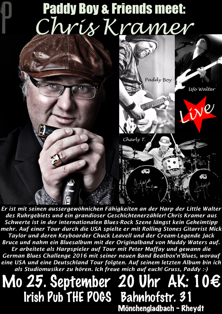 „Er ist mit seinen aussergewöhnichen Fähigkeiten an der Harp der Little Walter des Ruhrgebiets und ein grandioser Geschichtenerzähler! Chris Kramer aus Schwerte ist in der internationalen Blues-Rock Szene längst kein Geheimtipp mehr. Auf einer Tour durch die USA spielte er mit Rolling Stones Gitarrist Mick Taylor und deren Keyboarder Chuck Leavell und der Cream-Legende Jack Bruce und nahm ein Bluesalbum mit der Originalband von Muddy Waters auf. Er arbeitete als Harpspieler auf Tour mit Peter Maffay und gewann die German Blues Challenge 2016 mit seiner neuen Band Beatbox’n’Blues, worauf eine USA und eine Deutschland Tour folgten. Auf seinem letzten Album bin ich als Studiomusiker zu hören. Ich freue mich auf euch! Gruss, Paddy :-)“