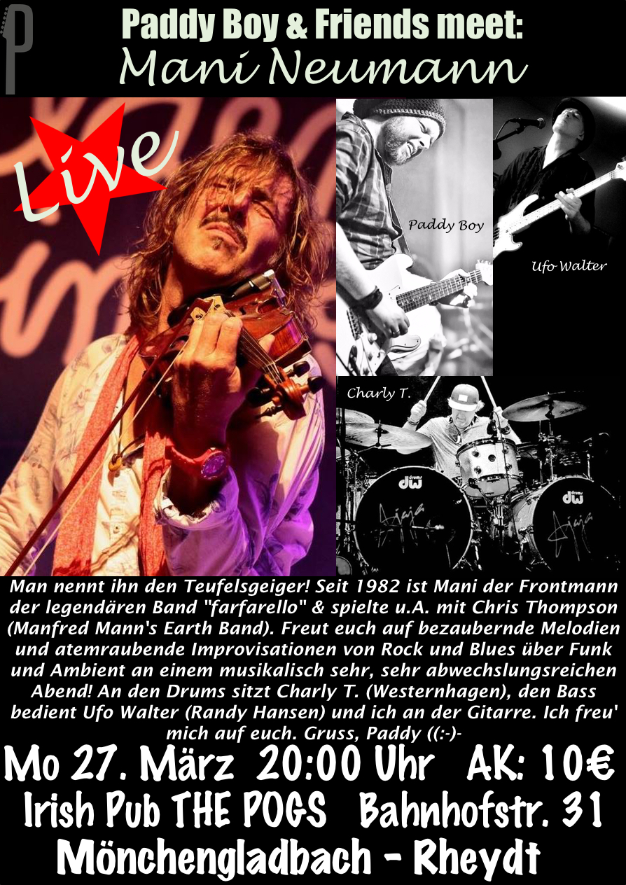 Man nennt ihn den Teufelsgeiger! Seit 1982 ist Mani Neumann der Frontmann der legendären Band „farfarello“ & spielte u.A. mit Chris Thompson (Manfred Mann’s Earth Band). Freut euch auf bezaubernde Melodien und atemraubende Improvisationen von Rock und Blues über Funk und Ambient an einem musikalisch sehr, sehr abwechslungsreichen Abend! An den Drums sitzt Charly T. (Westernhagen), den Bass bedient Ufo Walter (Randy Hansen Band) und ich an der Gitarre.