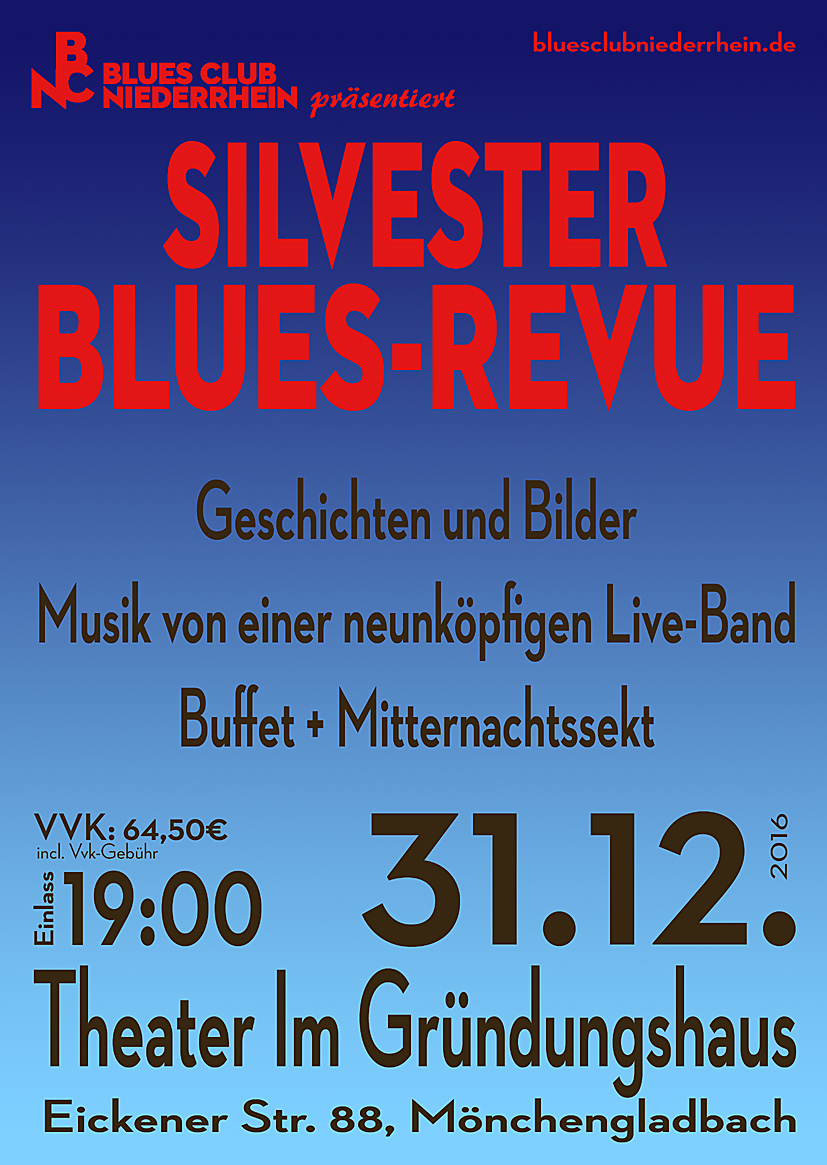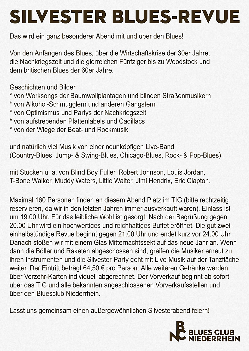 Wer sie noch nicht gesehen hat oder noch einmal erleben möchte sollte sich beeilen. In diesem Jahr findet die Silvester Blues-Revue im TIG zum 5. und zum letzten Mal statt und es gibt noch eine begrenzte Anzahl von Karten.