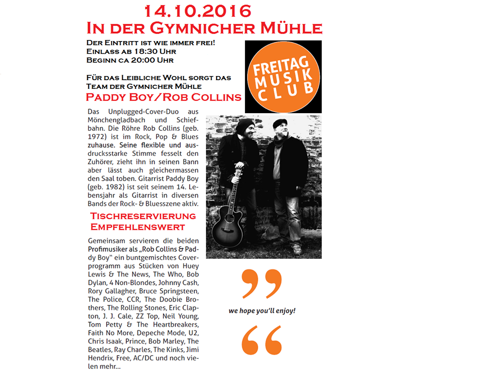 Am Freitag, den 14.10. spiele ich wieder mit ROB COLLINS & PADDY BOY live und „umsonst“ in der Gymnicher Mühle. Kommt zahlreich 😉