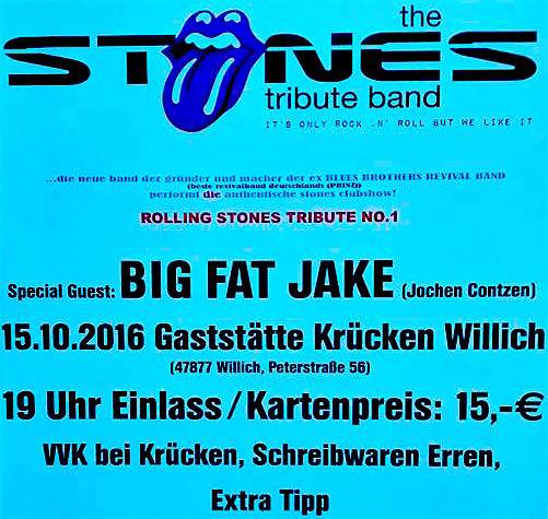 Am Samstag, den 15.10. spielen wir mit THE STONES TRIBUTE BAND unsere jährliche Show im grossen Saal der Gaststätte Krücken in Willich.