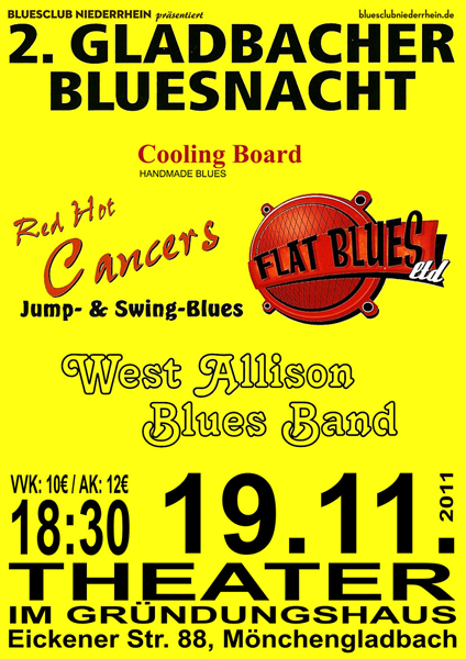 Im kommenden Samstag verstanstalten wir mit dem BLUES CLUB NIEDERRHEIN die 2. Gladbacher Bluesnacht. Wir werden dort wieder mit FLAT BLUES LTD. auftreten mit einigen Special Guests und wieder ein paar klasse Bluesbands im Schlepptau haben. Ihr dürft gespannt sein.